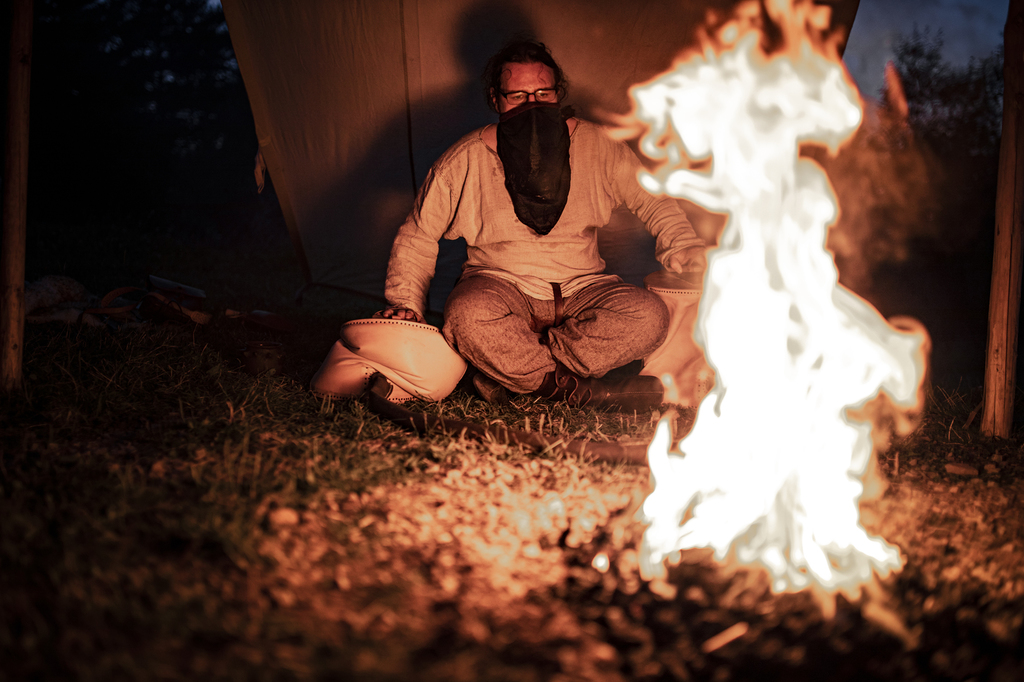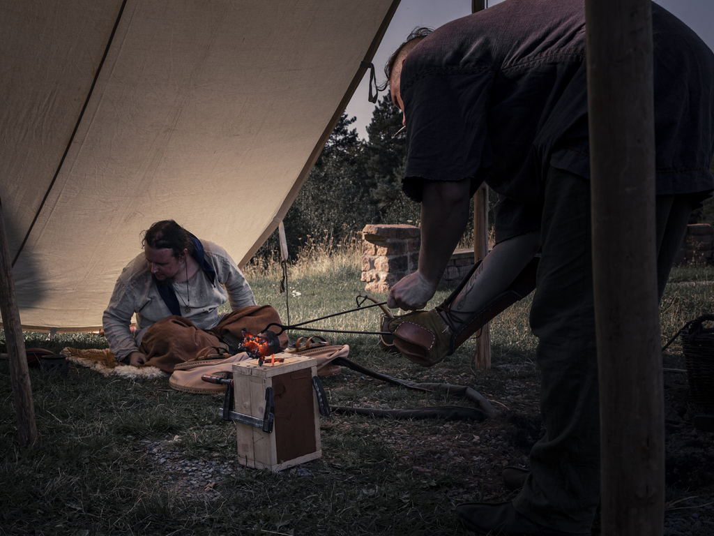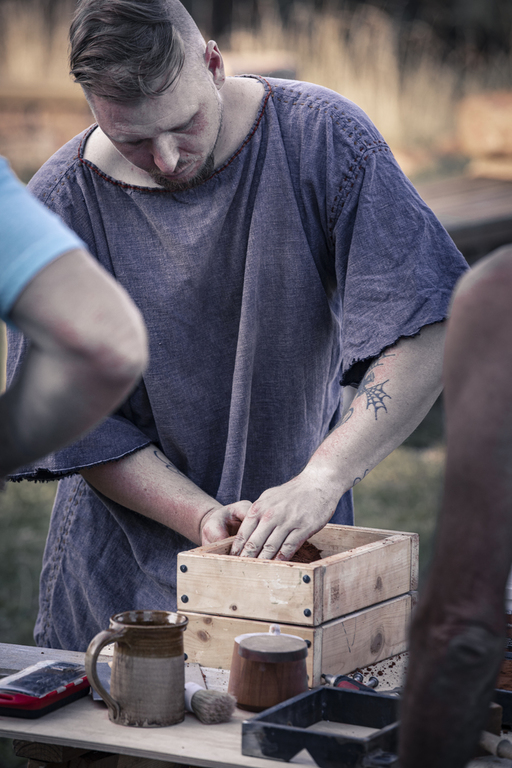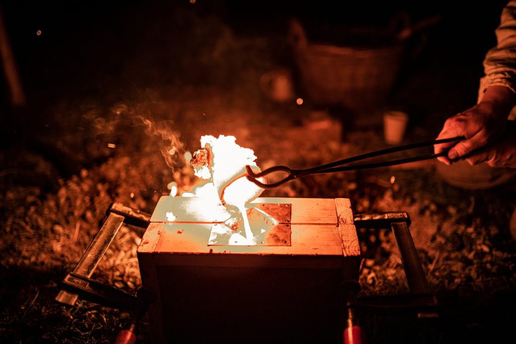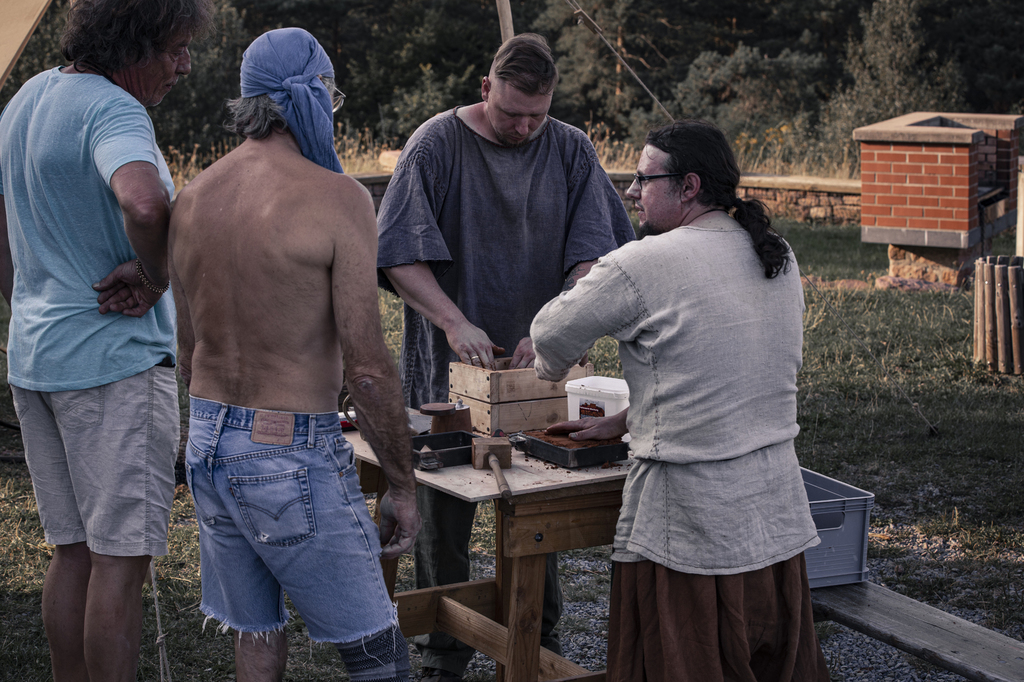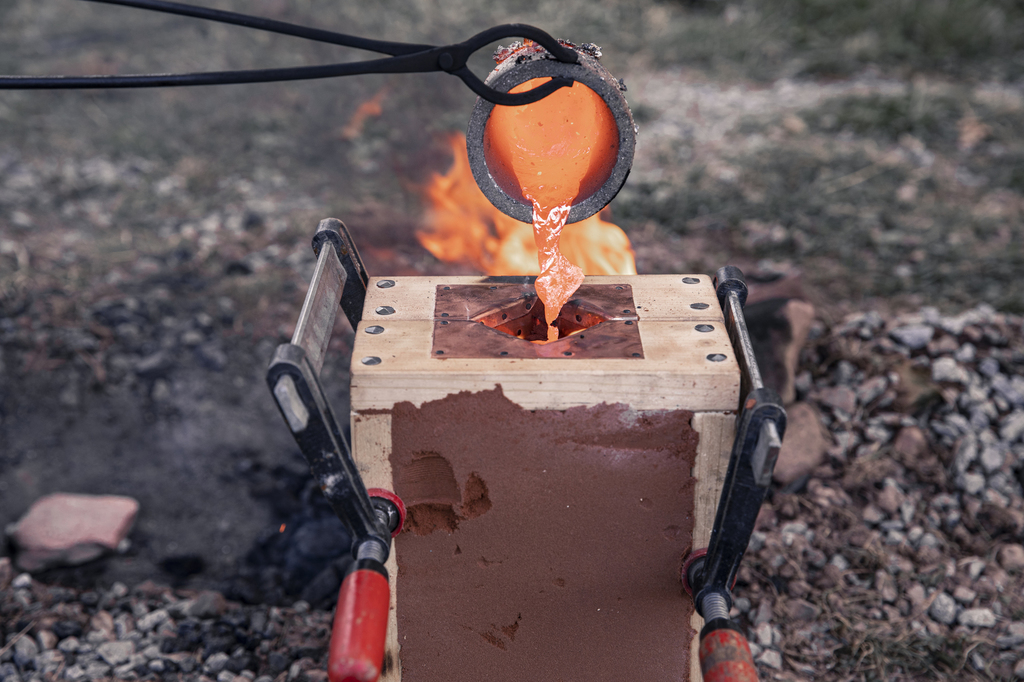 Doch das Bronze gießen war trotzdem eine schweißtreibende Angelegenheit, denn das Feuer braucht ständig Luft um die Temperatur zu halten.